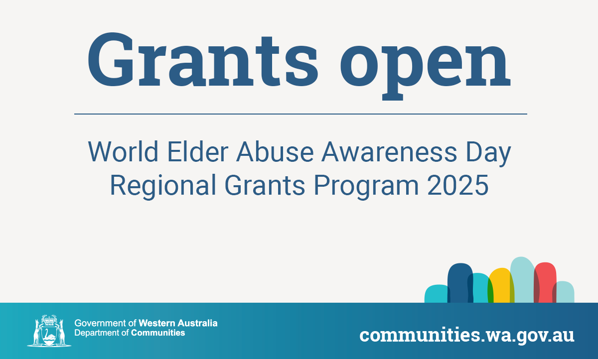 Regional local governments and registered not-for-profit organisations around Western Australia can apply for grants to hold initiatives in regional areas to mark World Elder Abuse Awareness Day, held on 15 June each year.