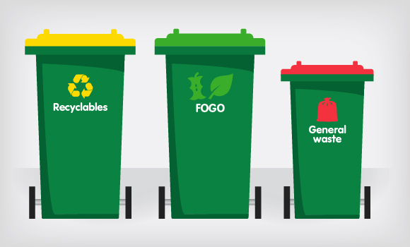 The three-bin FOGO kerbside collection service consists of a red-lid bin for general waste, a yellow-lid bin for co-mingled recycling, and a green-lid bin for FOGO.