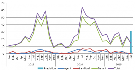 In July 2014 Consumer Protection saw a growth in mould issues, raised mostly by tenants but also by landlords and property managers in WA. The seasonal spike, also seen in 2013, can be attributed to cooler, wetter weather and means we’re expecting similar figures around now and in the months up to October.