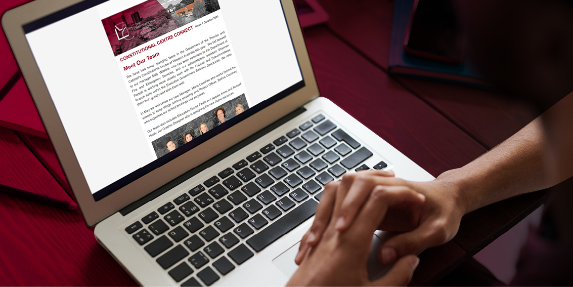 Home WA Government Announcements Constitutional Centre Connect Newsletter Constitutional Centre Connect Newsletter News story Subscribe to our Constitutional Centre Connect Newsletter to find out about newly developed resources, events and activities. Last updated: 28 March 2023 Previous Editions Issue 1 October 2021 Issue 2 December 2021 Special Edition February 2022 Special Edition March 2022 Term 1 2022 Term 4 2022 Subscribe to the newsletter here. Sidebar The Constitutional Centre of WA School Programs About Our Services Our History Subscribe to our newsletter Provided by Department of the Premier and Cabinet Published 26 October 2021 Contact Address: cnr Havelock Street and Parliament Place, WEST PERTH WA 6005 Telephone: 61 8 6552 5000 Email: cceducation@dpc.wa.gov.au Print this page Share Facebook share(Opens in a new tab/window) X(Opens in a new tab/window) LinkedIn(Opens in a new tab/window) Copy URL
