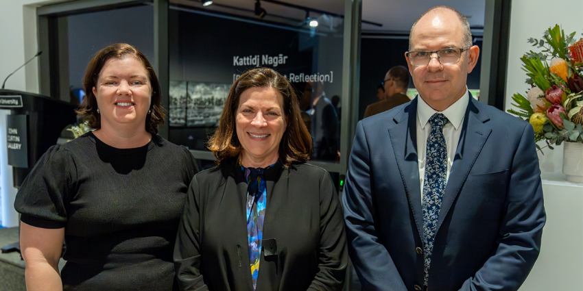 Department of Justice Acting Director General Kylie Maj, Curtin University Vice-Chancellor Professor Harlene Hayne and Corrective Services Commissioner Brad Royce at the exhibition opening.