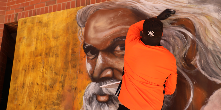 One of the exhibited artists, who began his studies in prison and transitioned to the campus after release, spray-painted a mural of an Aboriginal Elder at the gallery entrance for the event.