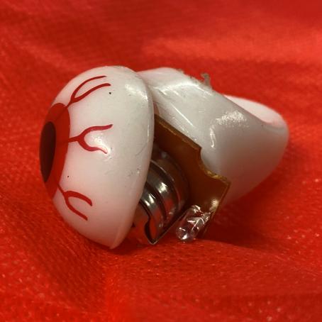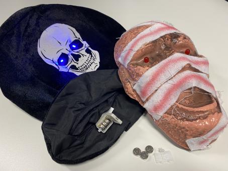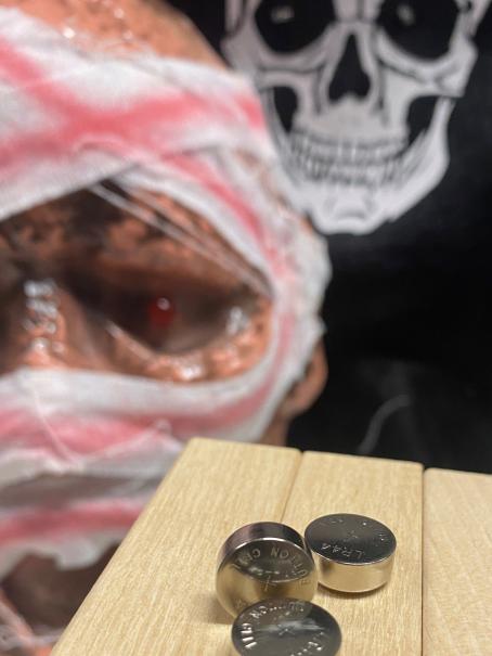 A zombie face mask and a skull hat were both found to have button batteries that easily fell out of unsecured plastic cases. A silicone eyeball flashing ring has been recalled because the outer material could tear and expose the unsecured button batteries inside.