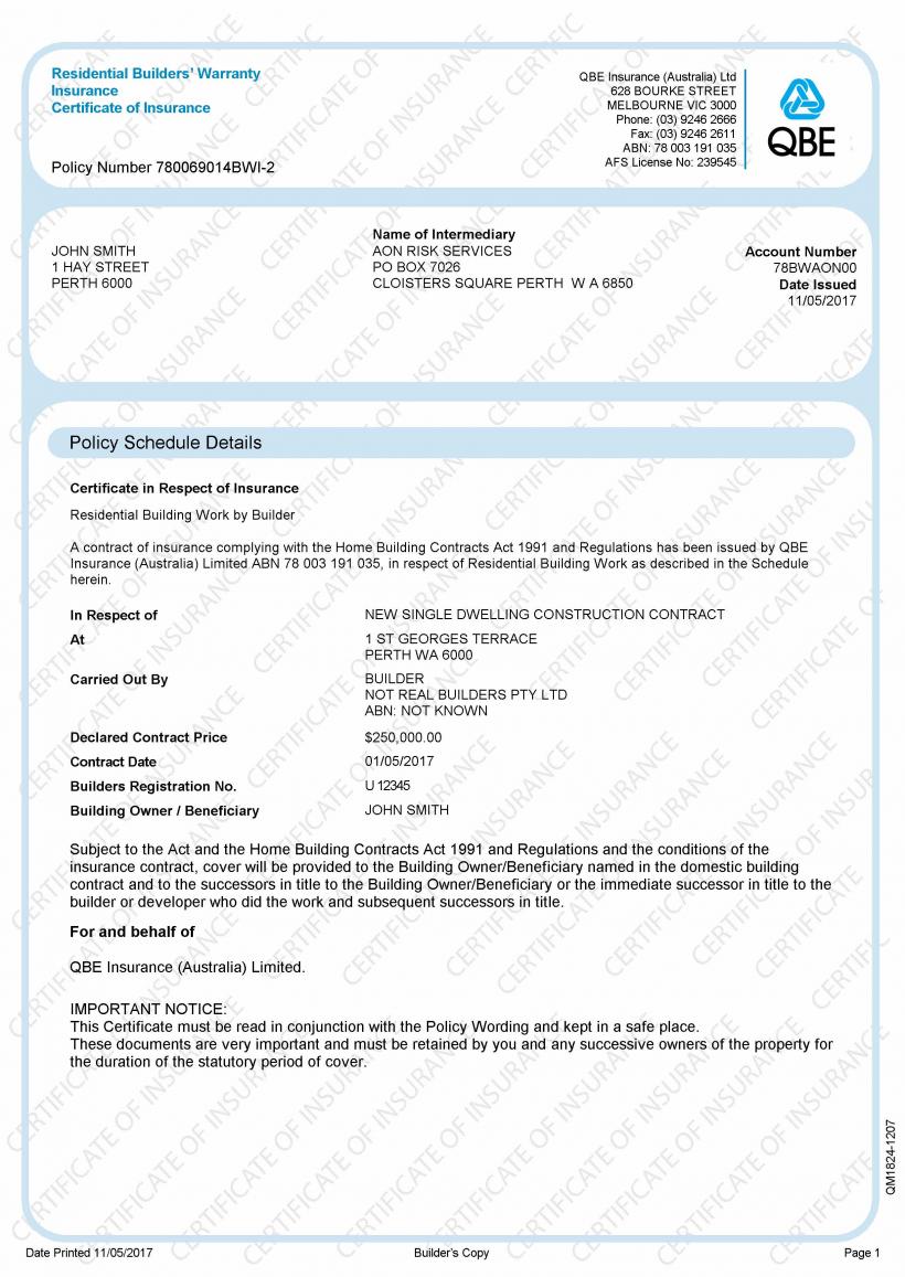 - QBE Insurance has published a Builders Warranty Insurance Certificate Register which can be used to confirm that the Certificate of Insurance your builder provided was issued by QBE. You can use the register to match the details on your Certificate with the QBE's records.