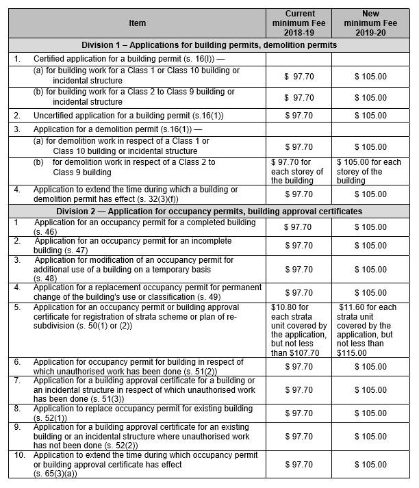 The minimum fees prescribed in Schedule 2 of the Building Regulations 2012 will increase by 7 per cent on 1 July 2019 for the 2019–20 year. A list of the current minimum fees and the new minimum fees is in the table below.