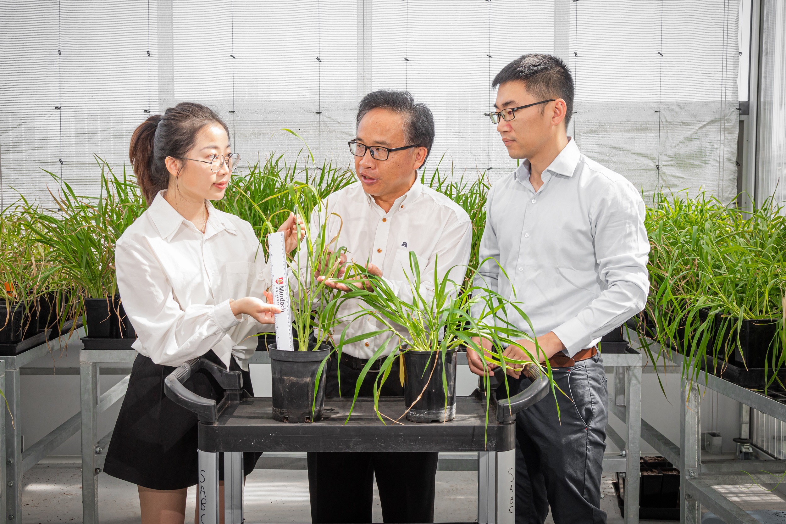 Picture caption: Jingye Cheng (PhD student of University of Tasmania and Murdoch University), Professor Chengdao Li (Western Crop Genetics Alliance director) and Dr Yong Han (DPIRD molecular geneticist) inspect the gene-edited RGT Planet with modified plant height and flowering time at the GRDC Grain Precinct at Murdoch University.