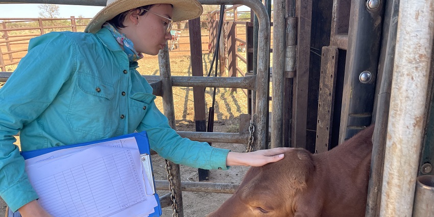 Caption: DPIRD Northern Beef development officer Rach Darwin inspects an animal involved in a new research project evaluating the animal welfare outcomes from pain relief treatments.