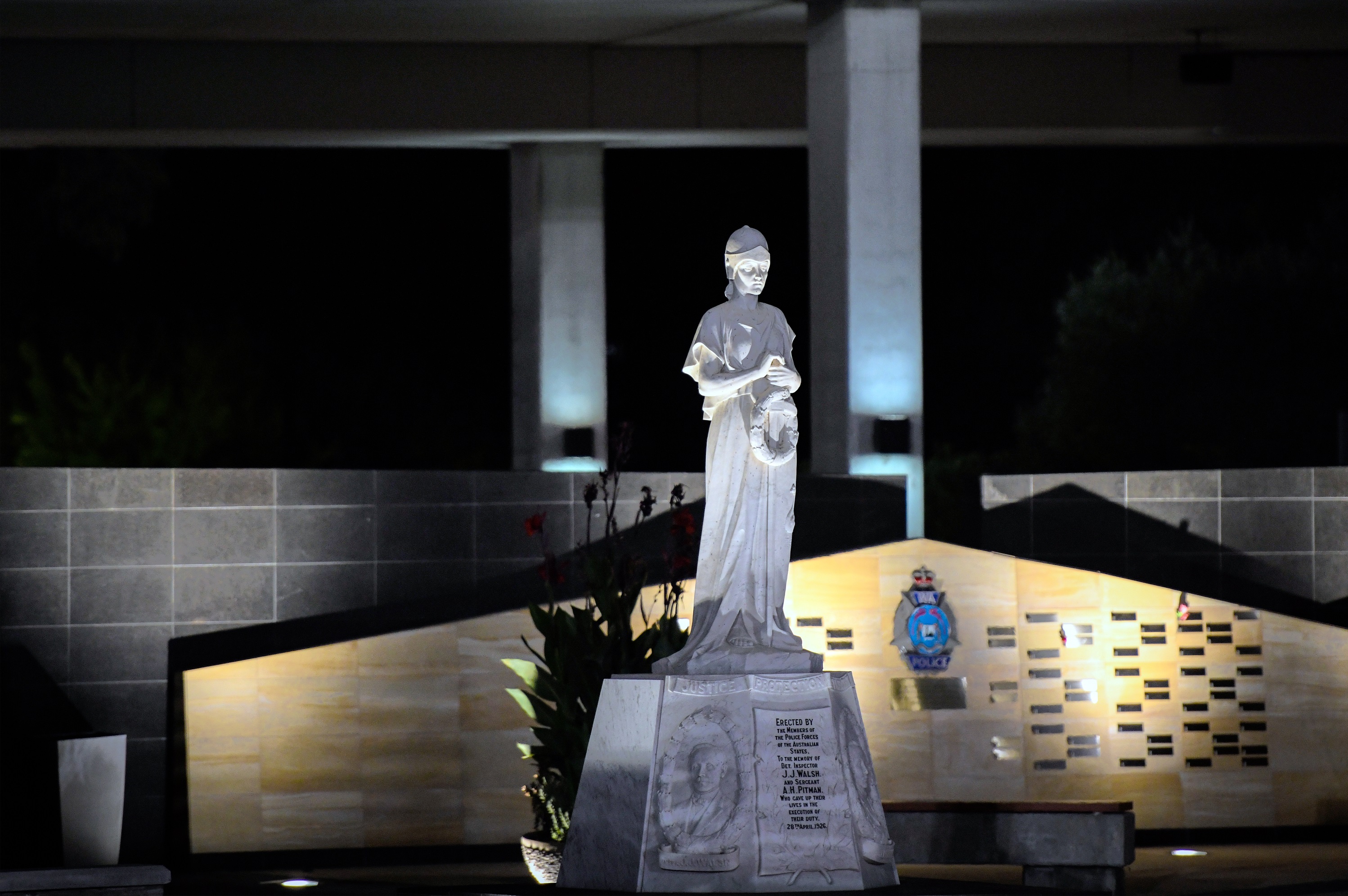 The memorial (pictured first, below) was designed by Constable D. Cummings of the Perth Traffic Branch and is a symbolic figure of justice with bowed head, but without the traditional blindfold.