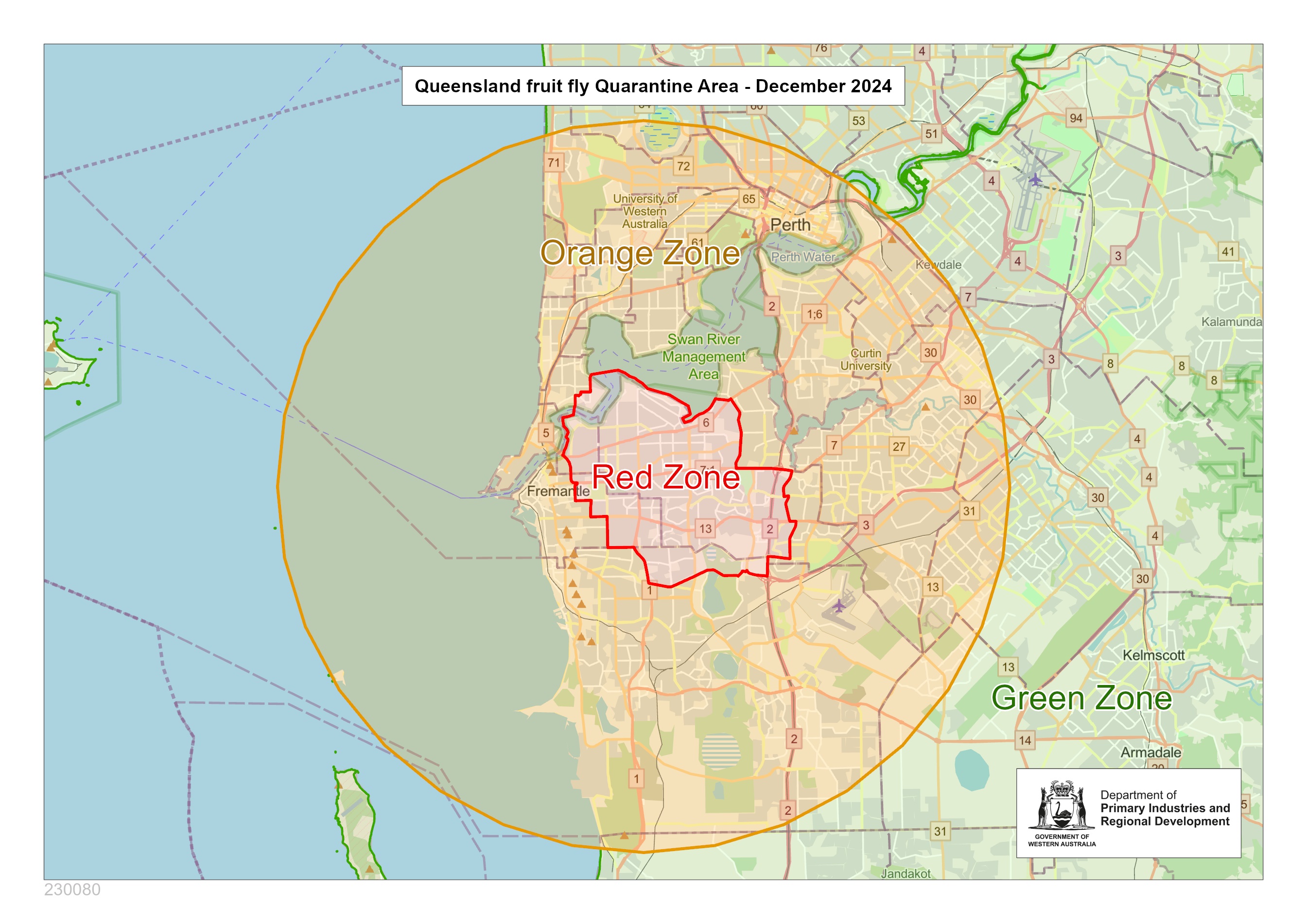The Quarantine Area includes two zones – a corrective action zone around where the pest was first found (Red Zone) and a buffer zone of surrounding suburbs within a 15 kilometre radius of the initial detections (Orange Zone).
