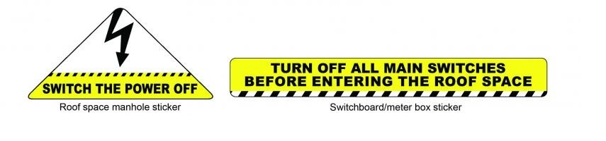 Building and Energy is now distributing free safety stickers to be placed on manholes and switchboards as a reminder to turn off the main switch at the property’s switchboard or meter box before entering the roof space.