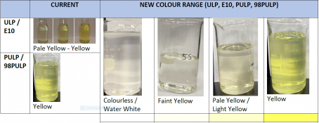 In 2015/16 the removal of red/orange dye from ULP and E10 resulted in these grades being coloured pale yellow to yellow, but premium grades of petrol (PULP/95 RON and 98 RON) were still required to be coloured yellow. Now, all grades of unleaded petrol may range from colourless to yellow (refer to chart below).