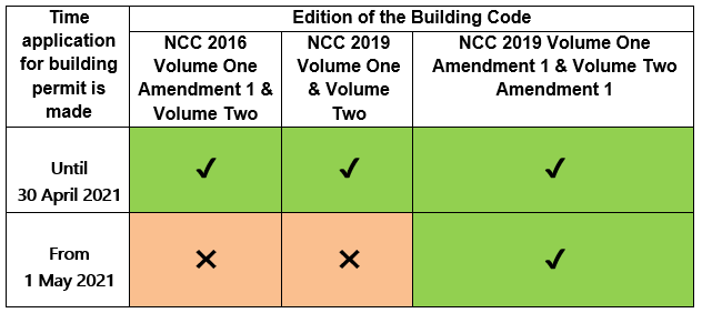 It is recommended that NCC 2019 Amendment 1 is used for current and upcoming design proposals, particularly where there may be a chance that the building permit application cannot be made prior to 1 May 2021.