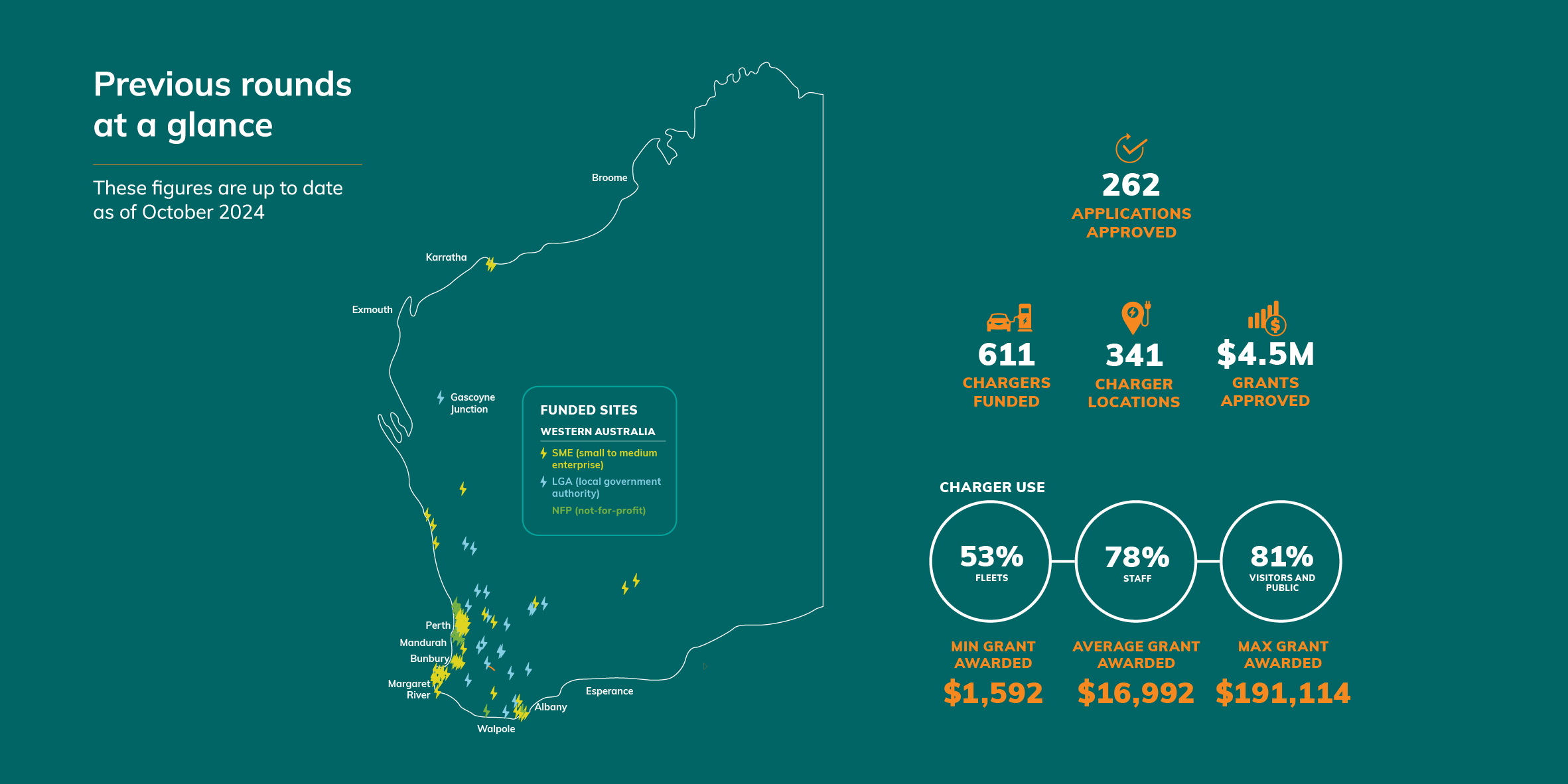 - Round 1, which closed on 31 July 2023, co-funded SMEs, LGAs and NFPs to install alternating current (AC) chargers.