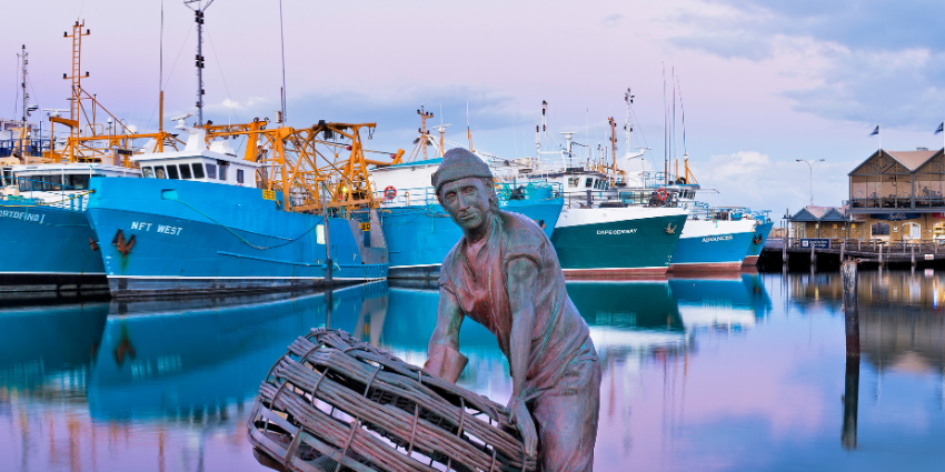 Fishing Boat Harbour in Fremantle is a well-known tourism precinct characterised by panoramic waterfront views, iconic blue fishing vessels, vibrant hospitality venues and significant memorials. Walyalup, and connections from around the harbour to the sea, have long provided meeting places, a primary food source and spiritual connection for Whadjuk Noongar people. This area became one of the first landing sites of the Swan River Colony and has remained closely connected to Fremantle’s maritime identity ever since. Over the following century, fishermen used the natural harbour to moor their boats and sell their catch directly from the jetty. Over time, the harbour evolved from a simple jetty into a bustling hub for Western Australia’s fishing industry. Officially established as Fishing Boat Harbour in 1924, it has remained in continuous operation as a working harbour.