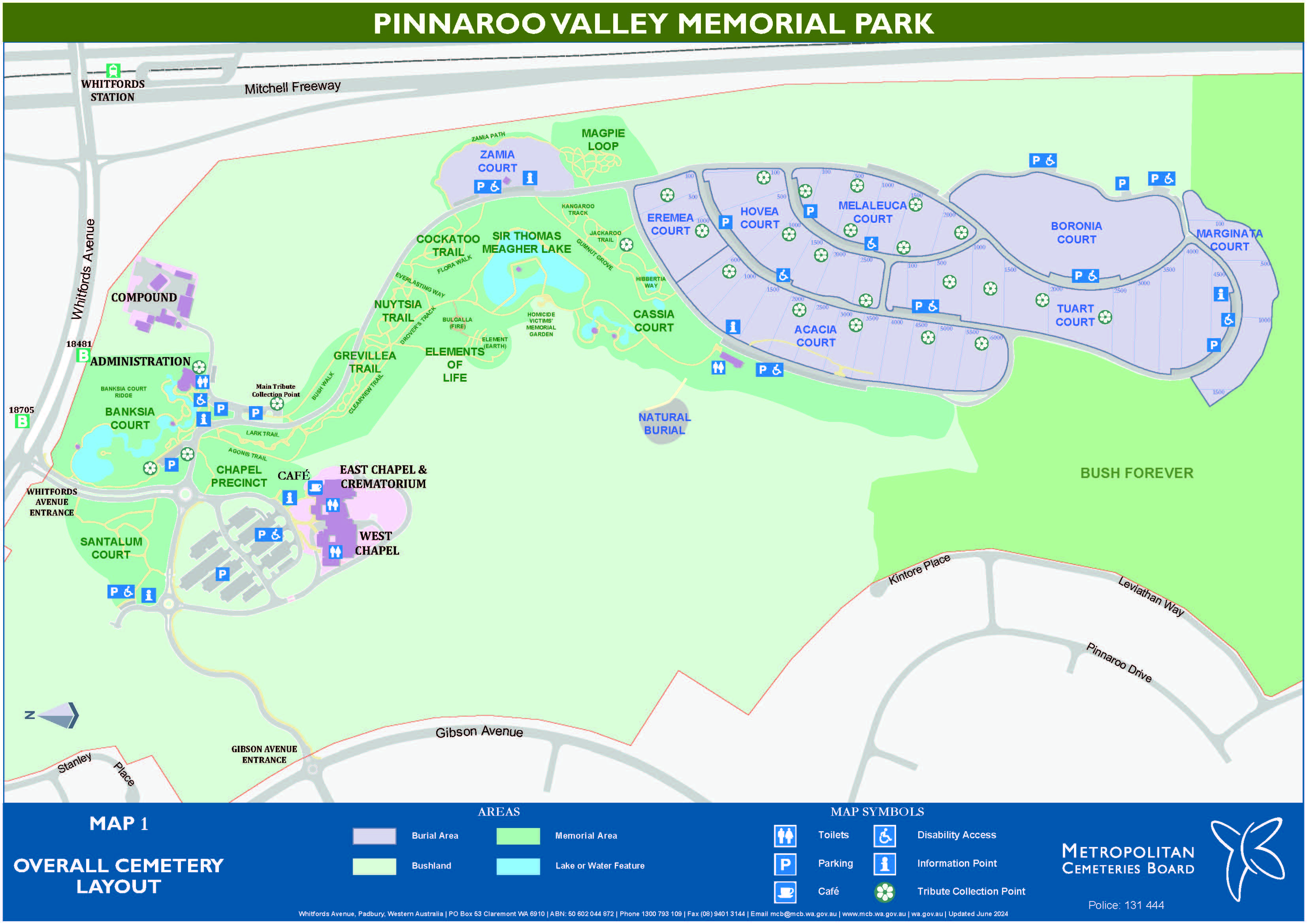 The main entrance to Pinnaroo Valley Memorial Park is on Whitfords Avenue in Padbury. The Park is located approximately 500 metres from the Whitfords Railway Station and the Mitchell Freeway.