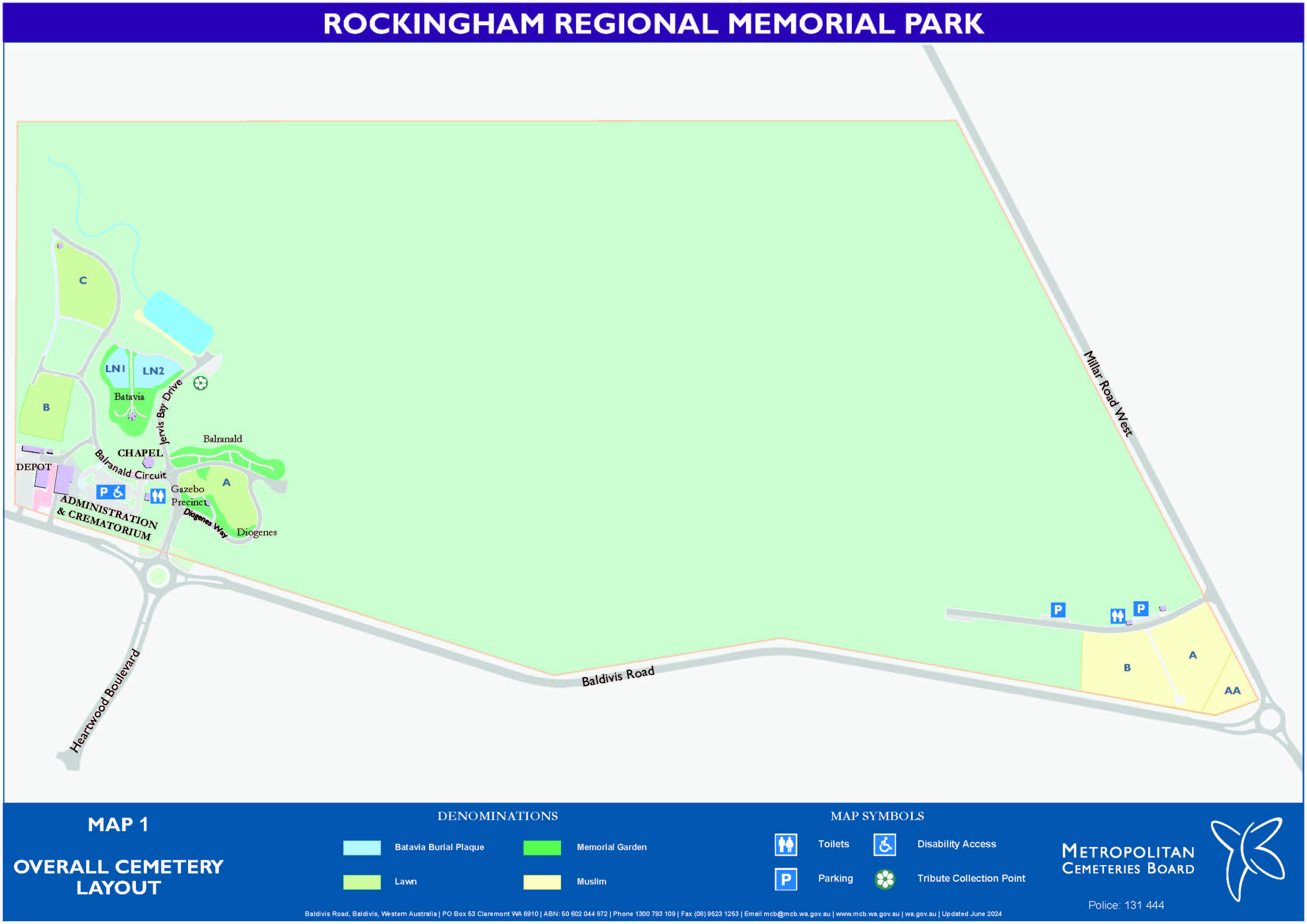 The main entrance is located on Baldivis Road in Baldivis. Visitors to the Muslim Burial section can access the area from Millar Road.