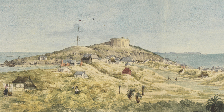 Section of a watercolour produced by Jane Currie in 1832 that highlights the imposing location of the Round House and its position over the newly established township of Fremantle. Image credit: Mitchell Library, State Library of New South Wales ML 827.