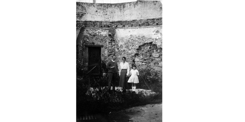 Captain Harold Rivers, Peggy Rivers and a friend standing inside the base of the Round House c1922. The photograph shows the poor condition of the building when demolition was proposed several times throughout the 1920s. Image credit: City of Fremantle Local History Centre (LH004701).