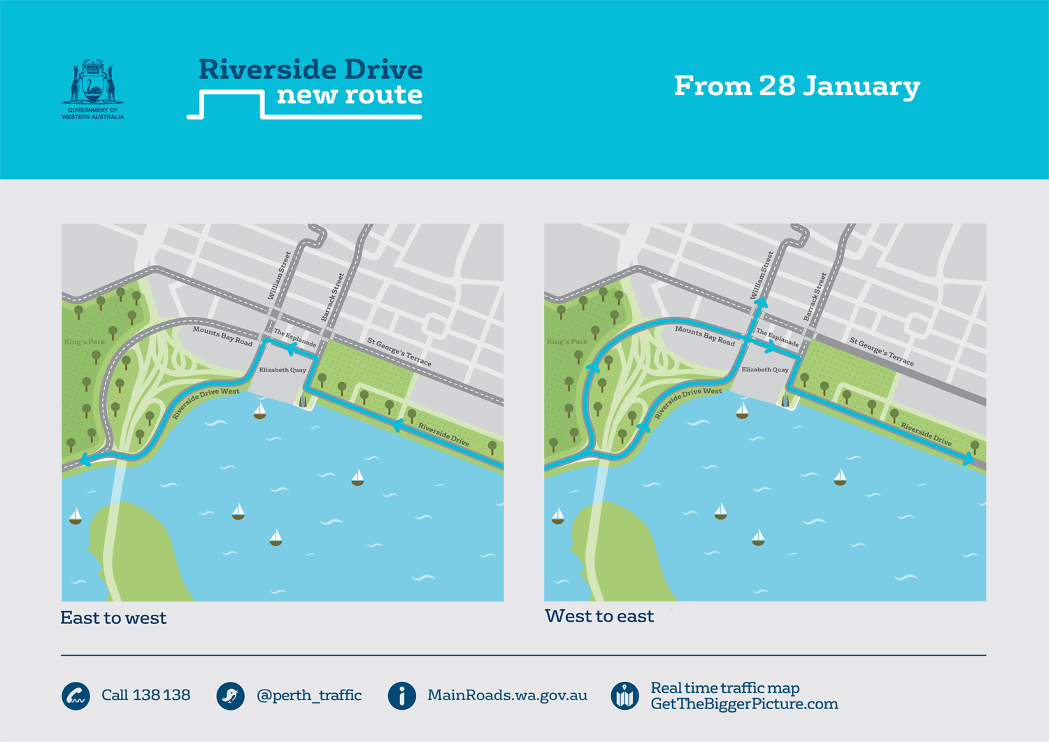 Information about the new Riverside Drive diversion route is available on the Main Roads website http://www.mainroads.wa.gov.au or via the 24-hour Customer Information Centre on 138 138.