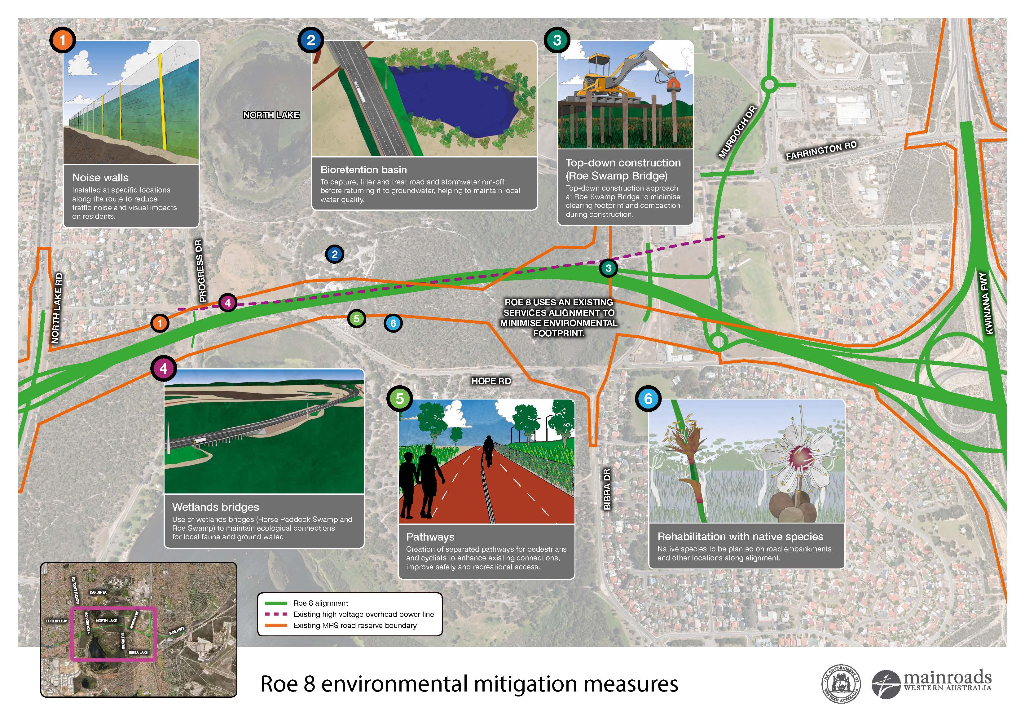 Roe 8 is a 5.2 kilometre extension of Roe Highway from Kwinana Freeway to Stock Road. It includes a major upgrade to the existing Kwinana Freeway-Roe Highway interchange as well as interchanges/flyovers at Murdoch Drive, Bibra Drive, Progress Drive, North Lake Road, Coolbellup Avenue and Stock Road. It is in the vicinity of the current MRS road reserve with some specific modifications made to minimise environmental impacts and reduce the project footprint