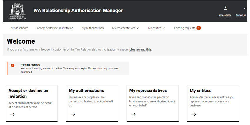 My authorisations also lists any pending (outstanding) requests you have submitted to be able to act on behalf of a business or person.An authorisation request is not an authorisation until it is approved by either the existing administrator or by an agency staff member. We recommend you contact the administrator of the business or person you are acting on behalf of in order to arrange approval of your request. Please be aware, if you contact the agency you will be asked to prove the nature of your relationship with the business/person and, if unable to do so, for security reasons your request will be declined.