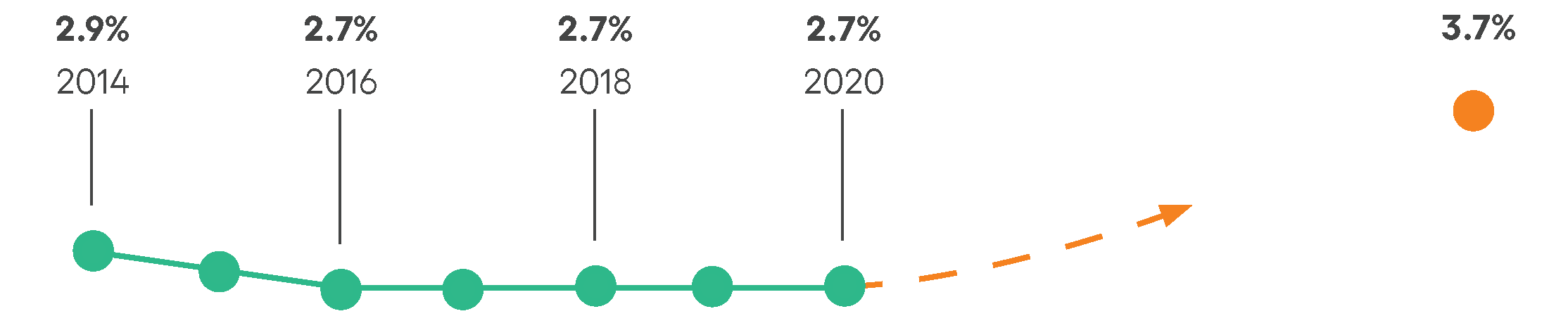 Current representation in public sector employment is at 2.7% and has been at this level for some time. In recent years, it was at its highest in 2013 at 3.0%.