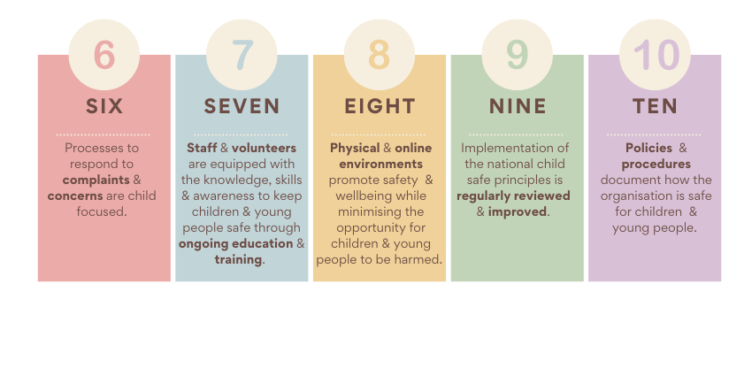 These principles set best practice standards but do not replace state and territory legal requirements. The 10 Child Safe principles are: