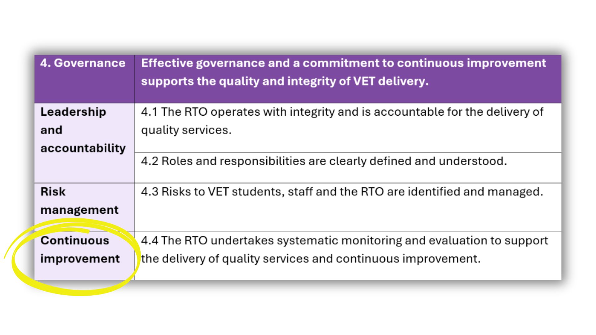 It is within Quality Area 4 that Continuous Improvement sits. Continuous Improvement allows RTOs to monitor and evaluate their performance, ensuring they operate to a high standard both in terms of ethical decision-making and outputs for learners.