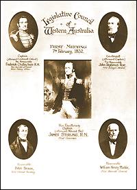 The first Legislative Council met on 7 February 1832, and passed a bill presented by Governor Stirling. The men shown here were all government officials. From 1839, some leading settlers were also appointed to the Council.