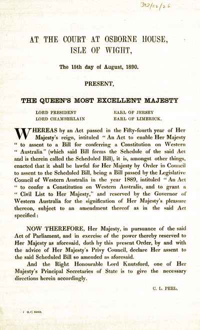 This exhibition gives an explanation of the chronological development of political change in Western Australia from British Settlement in 1829 until today. It is an historic account of how our political and constitutional system came about. It looks at the factors that influenced the development of the Western Australian Constitution and it also touches on the issues that led Western Australia to join the Federation of Australian States.
