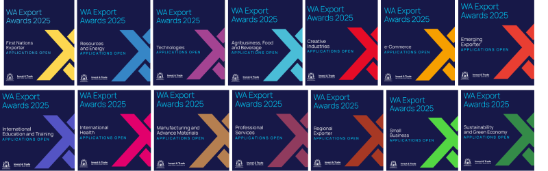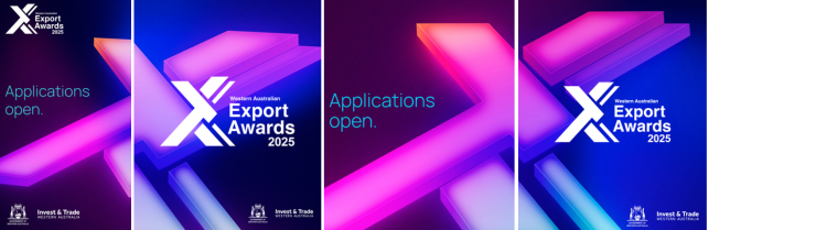 These social media tiles are for stakeholders to use to promote that applications are now open for the WA Export Awards 2025.