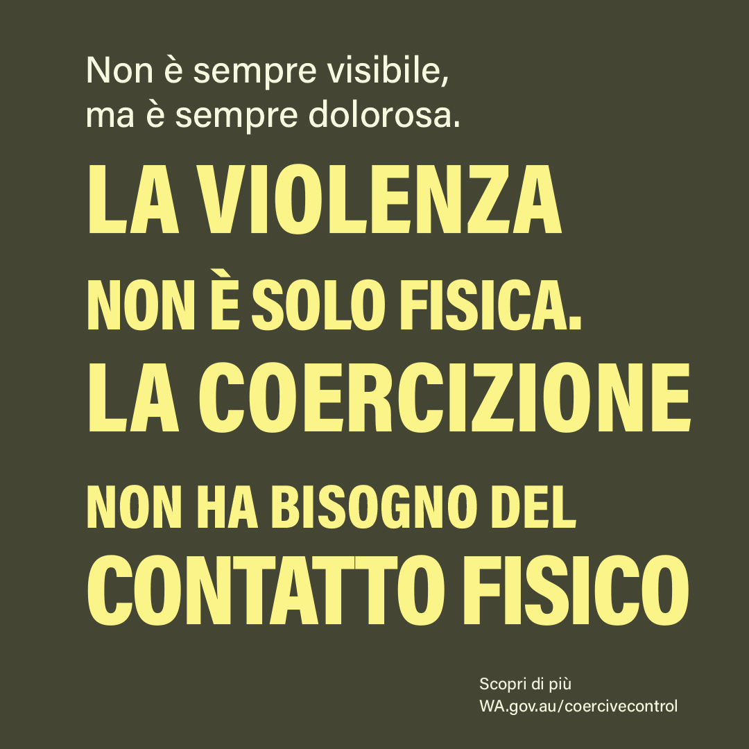 Find family and domestic violence video resources in Italian, including what coercive control is, how to help someone experiencing family and domestic violence, and what to do if you think you might be experiencing coercive control.