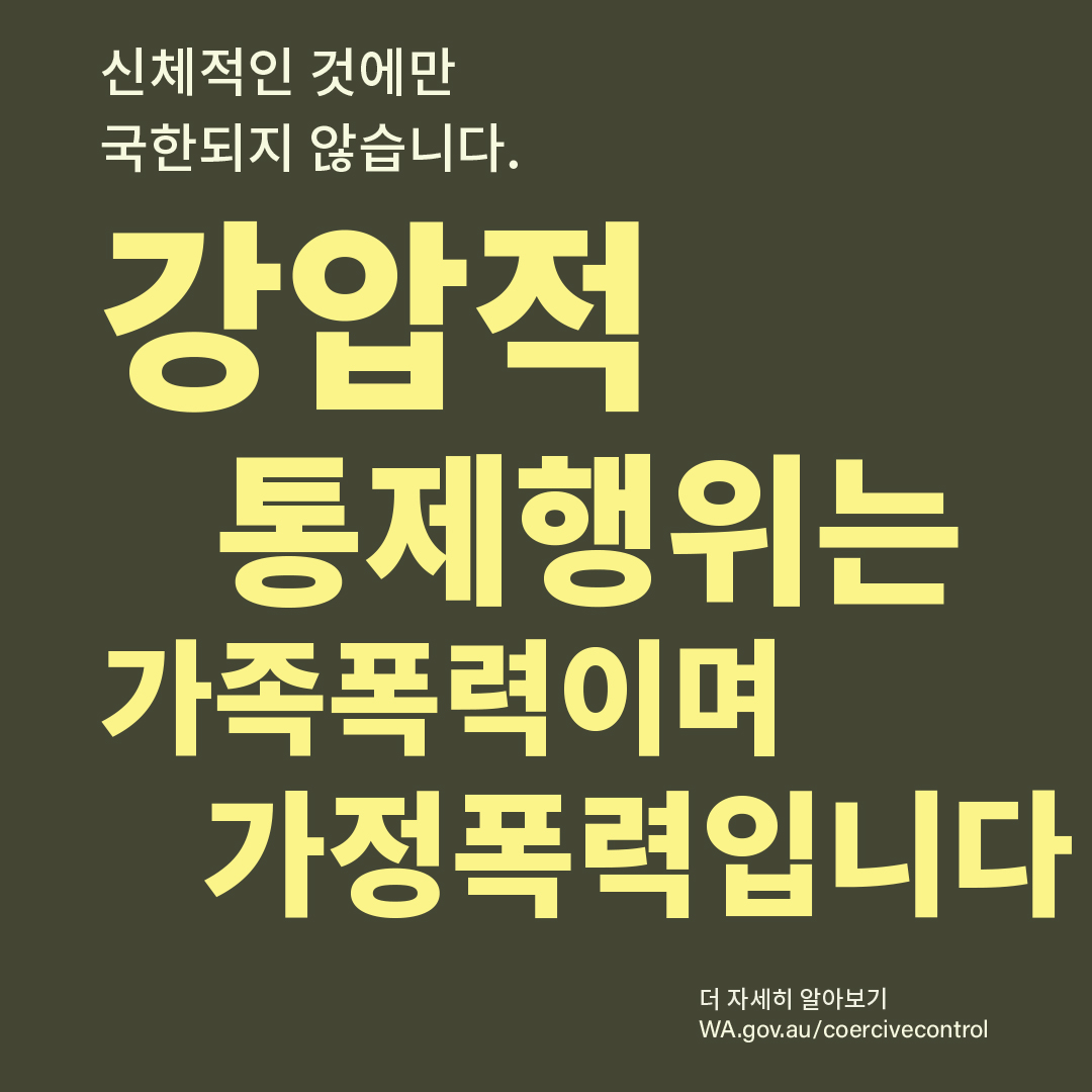 Find family and domestic violence video resources in Korean, including what coercive control is, how to help someone experiencing family and domestic violence, and what to do if you think you might be experiencing coercive control.