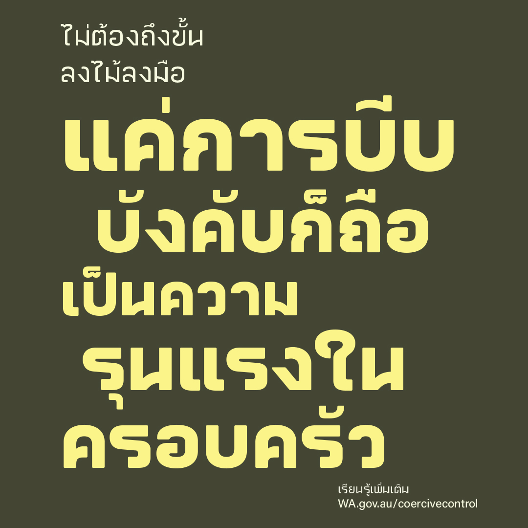 Find family and domestic violence video resources in Thai, including what coercive control is, how to help someone experiencing family and domestic violence, and what to do if you think you might be experiencing coercive control.