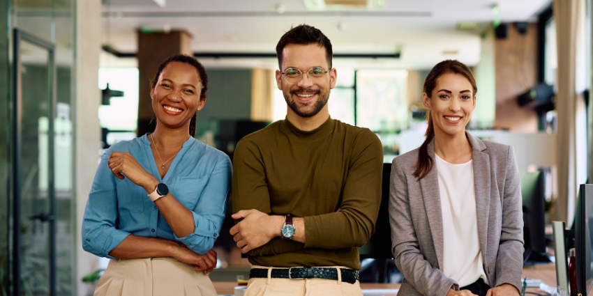A man and a woman in business wear, standing in a sunlit office and examining a sheet of paper