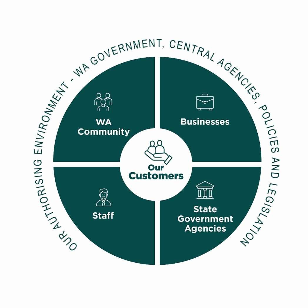 Four segmented wheel depicting customers. The segments read (left to right) WA Community, Businesses, Staff, State Government Agencies.