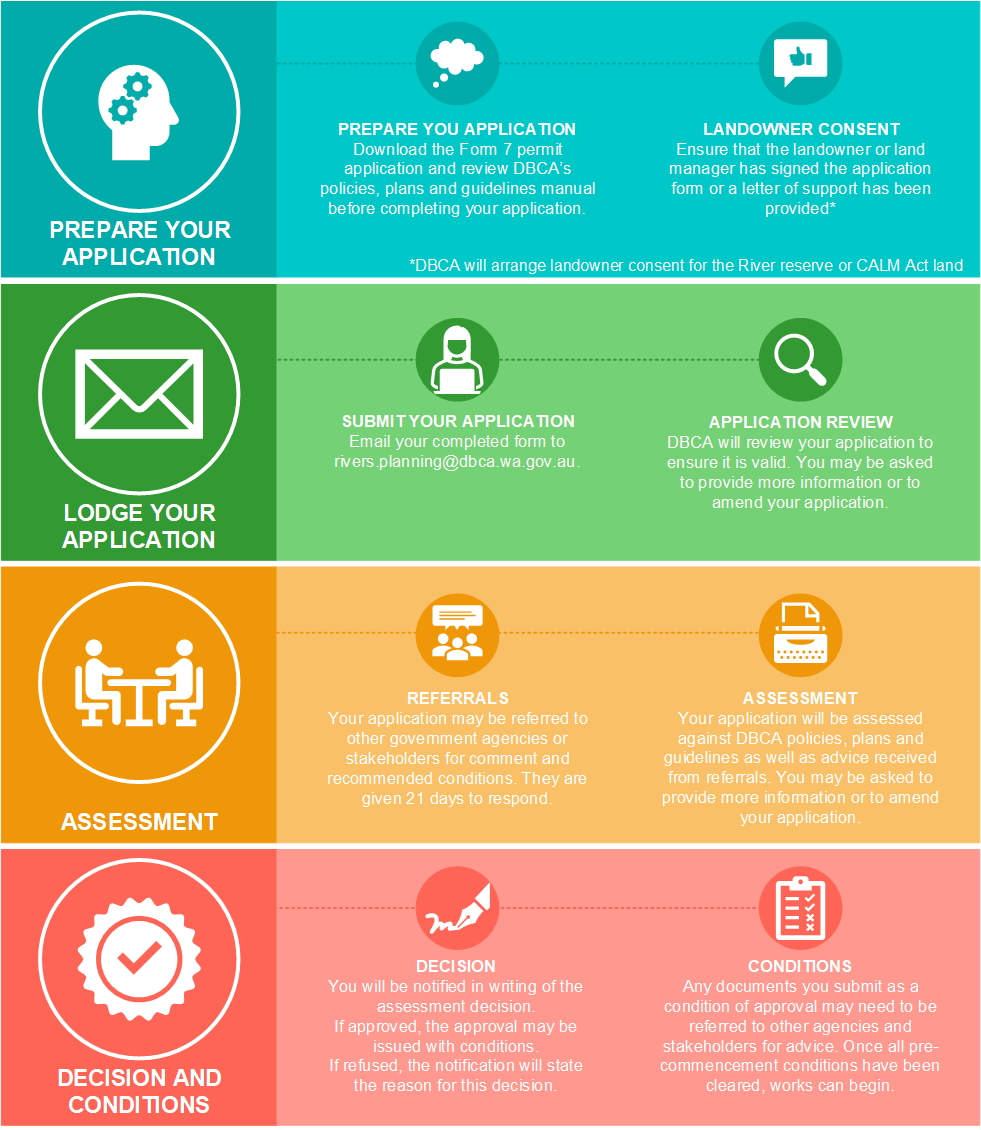 You are also encouraged to visit DBCA’s Polices, plans and guidelines manual page on its website. Your application will be assessed to ensure it is consistent with DBCA and other state policy.