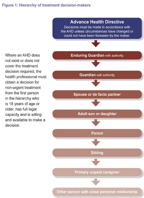 If a person has not made an AHD (or if it is invalid), the legislation sets out the order of people who the health professional will need to obtain a treatment decision from. This order is contained in sections 110ZJ and 110ZD of the Act and has been summarised for ease of understanding as 'the hierarchy of treatment decision-makers'.