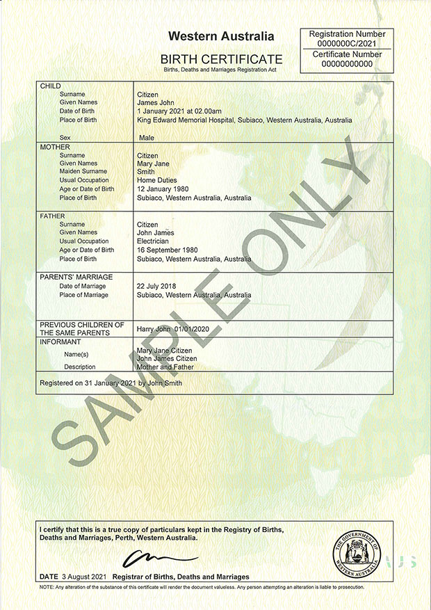 The Registry creates and preserves records of Western Australian births, deaths, marriages and changes of name in accordance with the Births, Deaths and Marriages Registration Act 1998. Eligible customers are able to apply for certificates from these records to be used for a range of legal, personal and historical purposes.