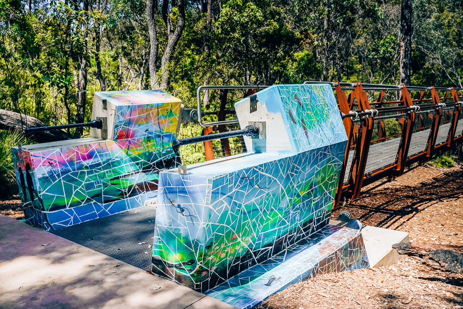 The bridge’s concrete footings feature a mural by local artist Natalie Veal, which depicts local plants and animals and a geometric pattern that represents the natural and cultural connections that exist in this ancient landscape. The blue lines represent the above-ground water table, while the thick white lines are the dividing lines between the different Willman tribes.