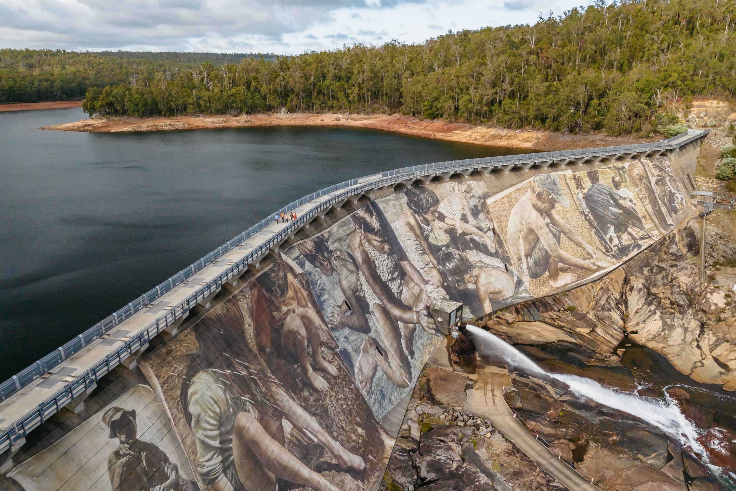 Part of the trail includes a mega mural of more than 8,000-square metres which adorns the wall of the Wellington Dam.