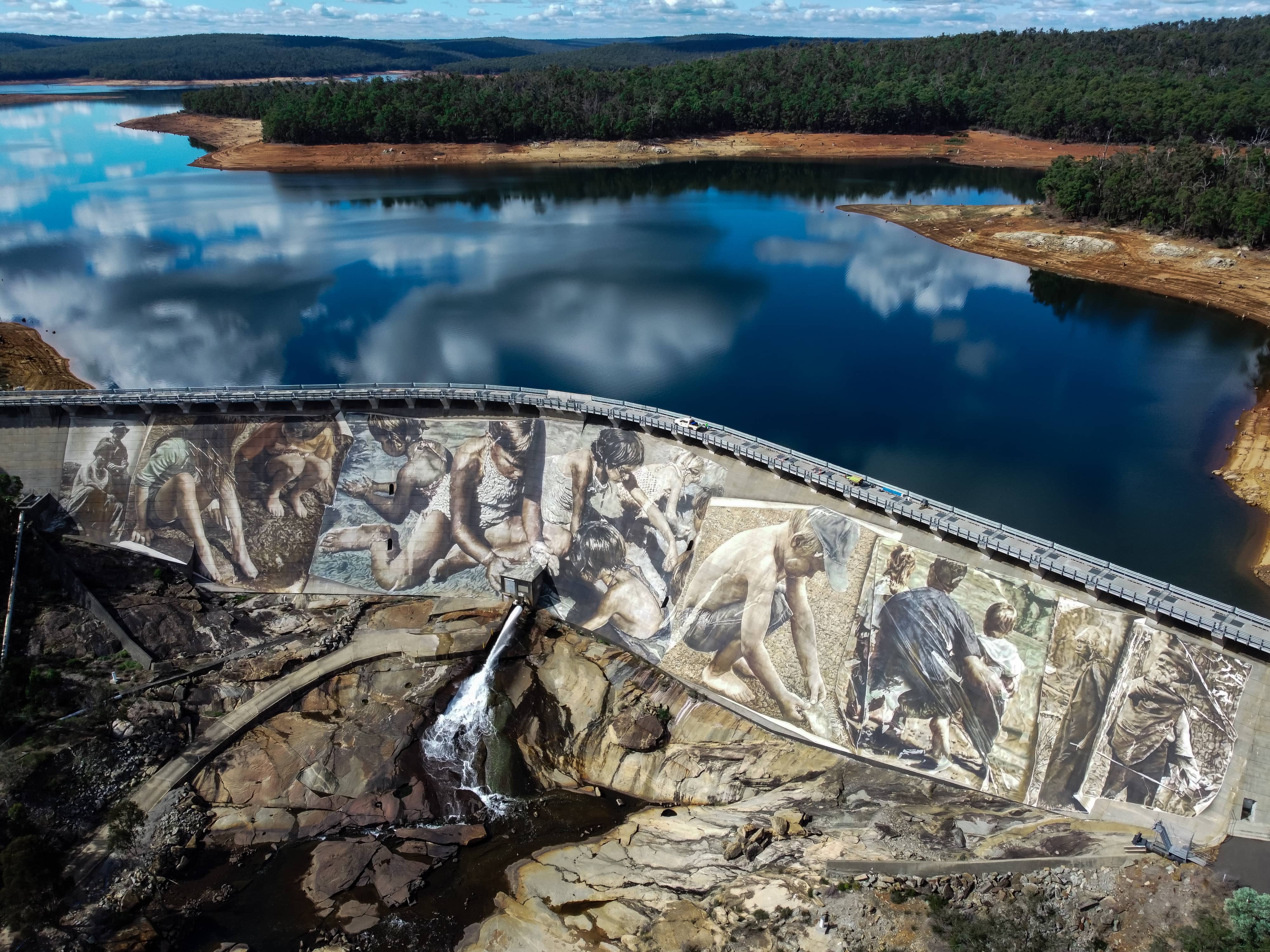 Affectionately known as the biggest dam mural in the world, the artwork was created by world-renowned Australian artist Guido van Helten, who consulted with the community, listened to their stories about the area and looked through their family photo albums to draw inspiration to create a design that represented the community.