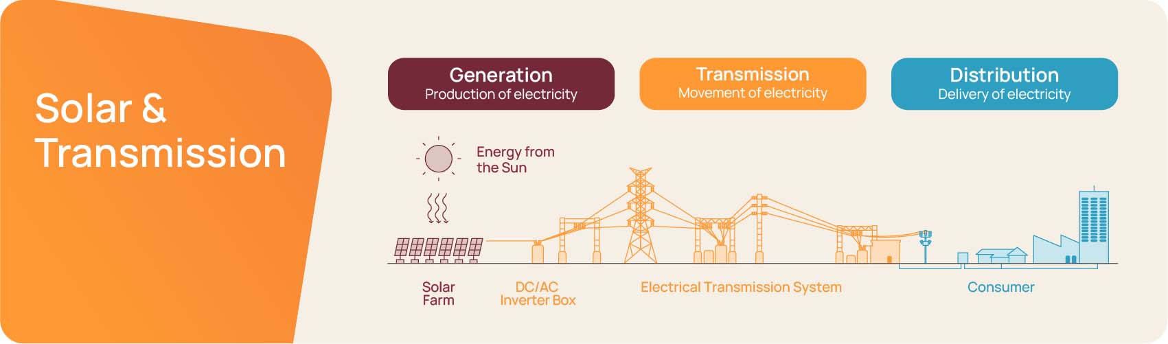 A solar farm generates renewable energy in the same way that rooftop solar works for homes and businesses. Solar panels capture sunlight and turn it into direct current (DC) electricity. This DC electricity is sent to a solar inverter, which changes it into alternating current (AC) electricity, which is the type of electricity used in homes and businesses. Transmission lines then transport this electricity to where it is needed. Transmission networks can be considered a ‘super highway’ that carries electricity through towers and wires to homes, businesses, and communities in WA.