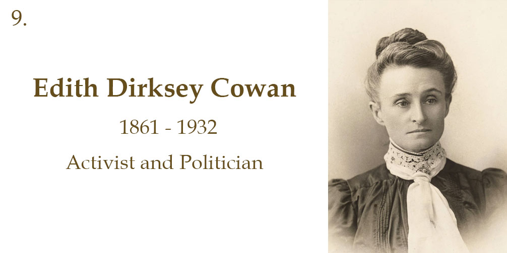 Edith Cowan was born into a York pioneering family. In 1868, when Edith was only seven years of age, her mother died giving birth to her sixth child. Edith and her older sister were sent to school in Perth. By the time she was 18, Edith had lost both parents and was married to James Cowan. The loss of both parents at a young age greatly influenced Edith and led to her commitment to protecting the vulnerable in society.