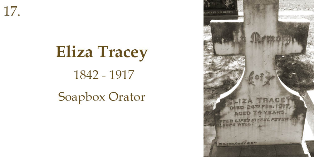 Eliza Tracey was a public figure, well known for her soapbox oratory on the Esplanade most Sundays. She harangued the citizens of Perth about thieving lawyers and the topical issues of the day.