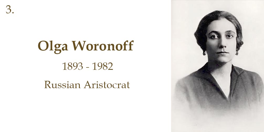 Olga Woronoff was born in Potchep, Russia, the daughter of Count Constantine Kleinmichel. Her memories of childhood and experiences of life in Russia before the Revolution of 1917 were published in a book, Upheaval, which she dedicated to her daughter, Tatiana. In the book she describes the deeply religious Russian Orthodox life of her aristocratic family.