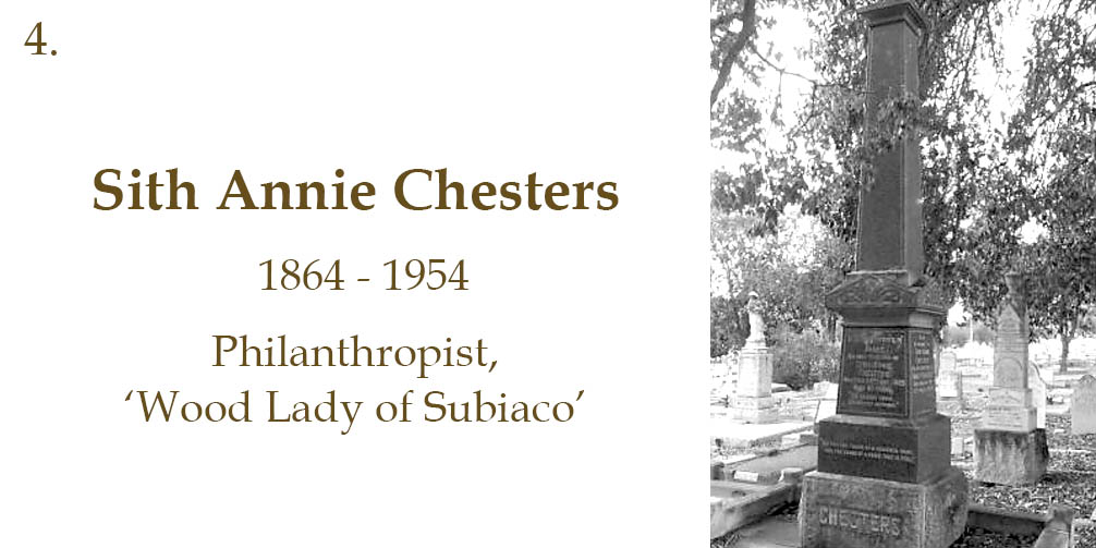 Sith Annie Chesters was born on 10 July 1864 to George Murray and Elizabeth Greenwood in Liverpool. In her earlier years Sith Chesters was always elegantly attired, usually donning large picture hats and white gloves. Her husband was James Chesters, a well-known builder in Subiaco, and Mayor of Subiaco from 1910-1912. He also served for a time as Trustee on the Karrakatta Cemetery Board.