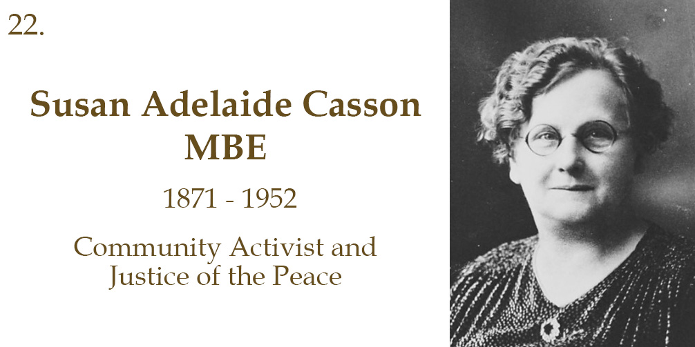 Susan founded the Mental Hospital After Care and Comforts Fund (MHACCF), now called Casson Homes, which is believed to be one of the first charities for mental health patients in Australia. She believed in the necessity for discharge of patients and rehabilitation into the community.
