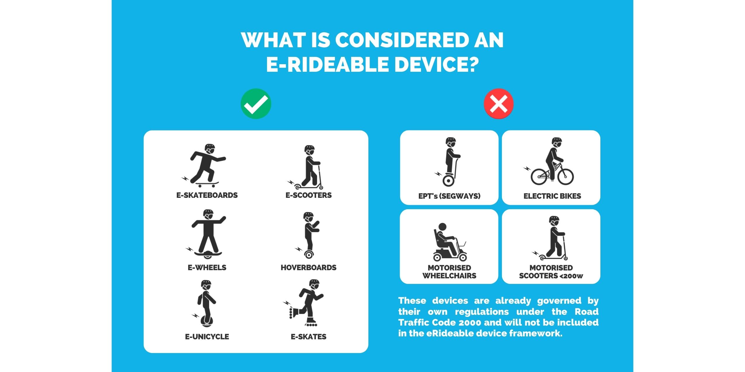 Explore the links below to find out more about what devices are considered eRideables, and information on offences and penalties.