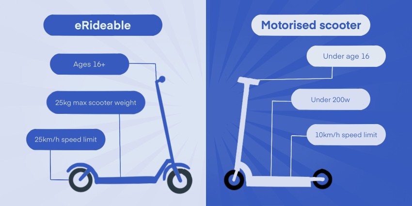 Other devices such as mobility scooters, motorised wheelchairs, or low-powered motorised scooters for children are not considered eRideables and are covered by their own rules. For more detail on the difference between eRideables, motorised scooters, and other similar devices, see 'eRideable definitions and buying guide' at the bottom of this page.